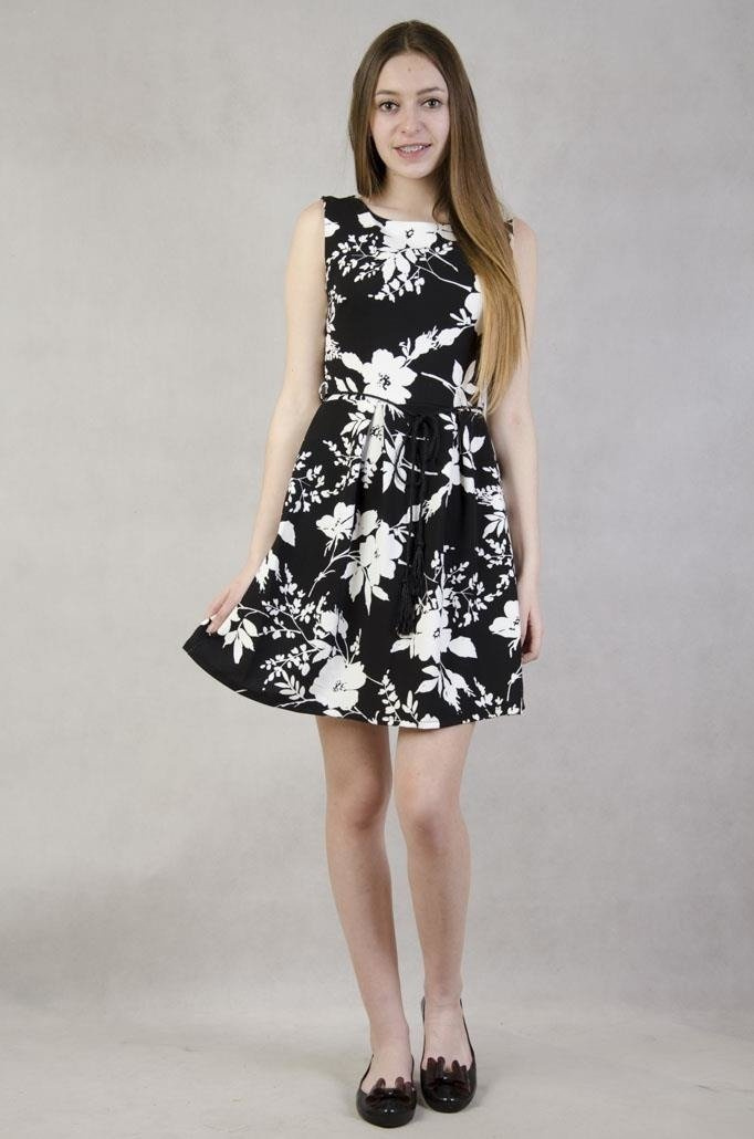 sukienka czarna w białe kwiaty w pasie wiązana na sznureczek