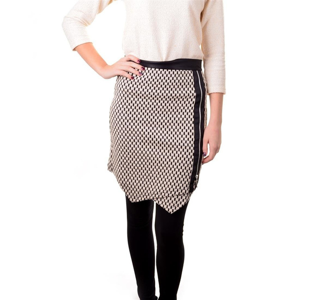Elegancka, dopasowująca się do sylwetki spódnica, w drobną szachownicę, z modnym plisowaniem z przodu. Po boku wstawka ze skóry ekologicznej z ozdobnym zamkiem.