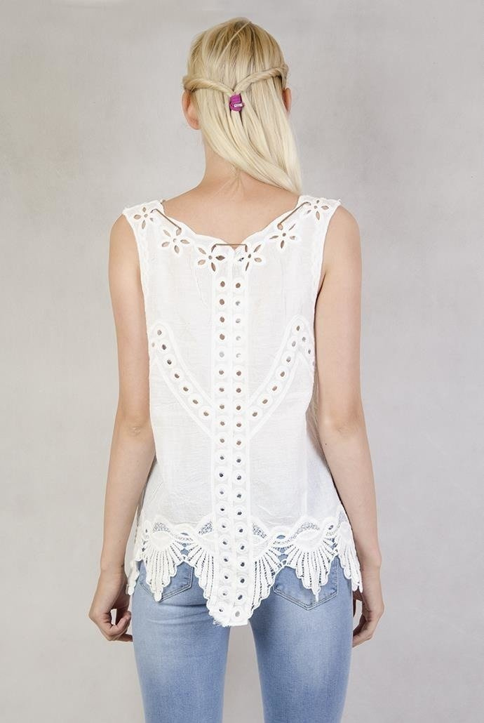 Biała bluzka w ażurowe wzorki z rzemykiem z piórkiem