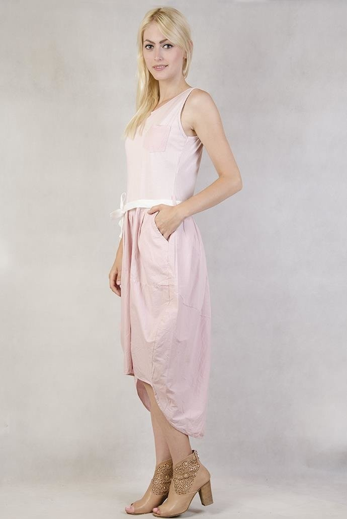 Różowa sukienka wiązana w pasie z przedłużanym tyłem