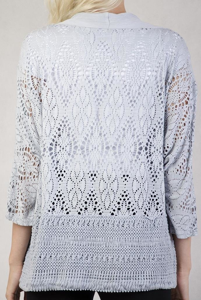 Koronkowa narzutka z szerokim plecionym pasem na dole szara