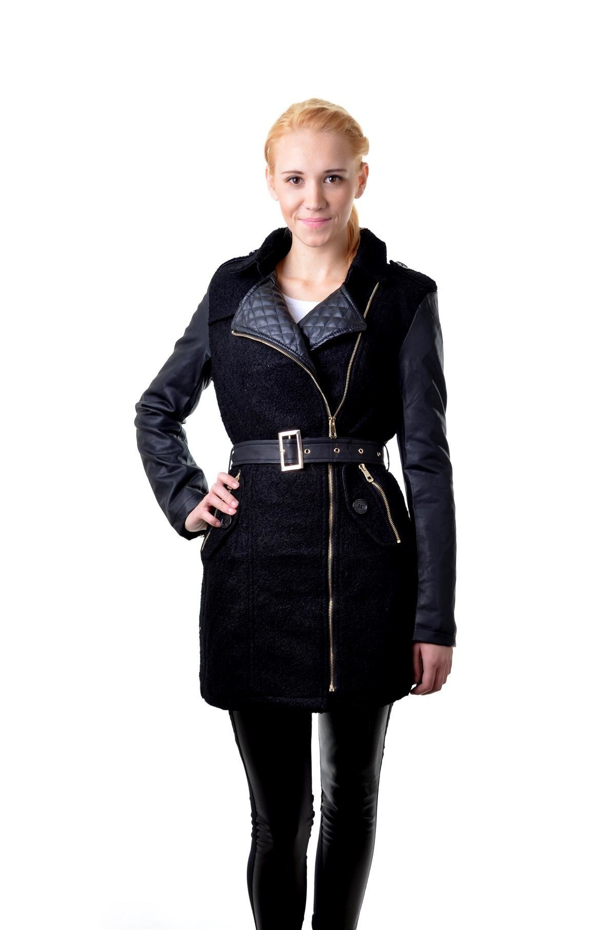 Stylowy i modny płaszcz z elementami ze skóry ekologicznej. Rękawy gładkie, kołnierz pikowany. Zapinany po skosie na zamek, oraz pasek.