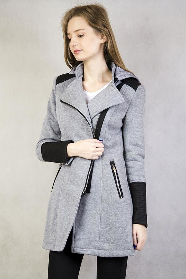 Jasnoszary płaszcz ze skóropodobnymi wstawkami