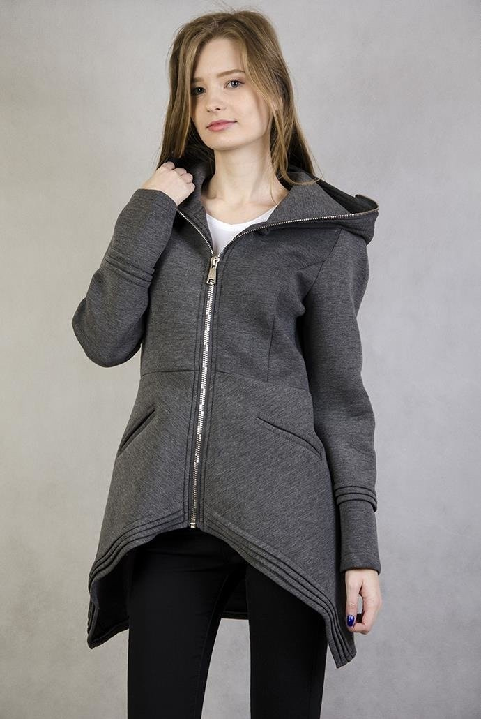 Wygodny, asymetryczny płaszczyk z kapturem.
