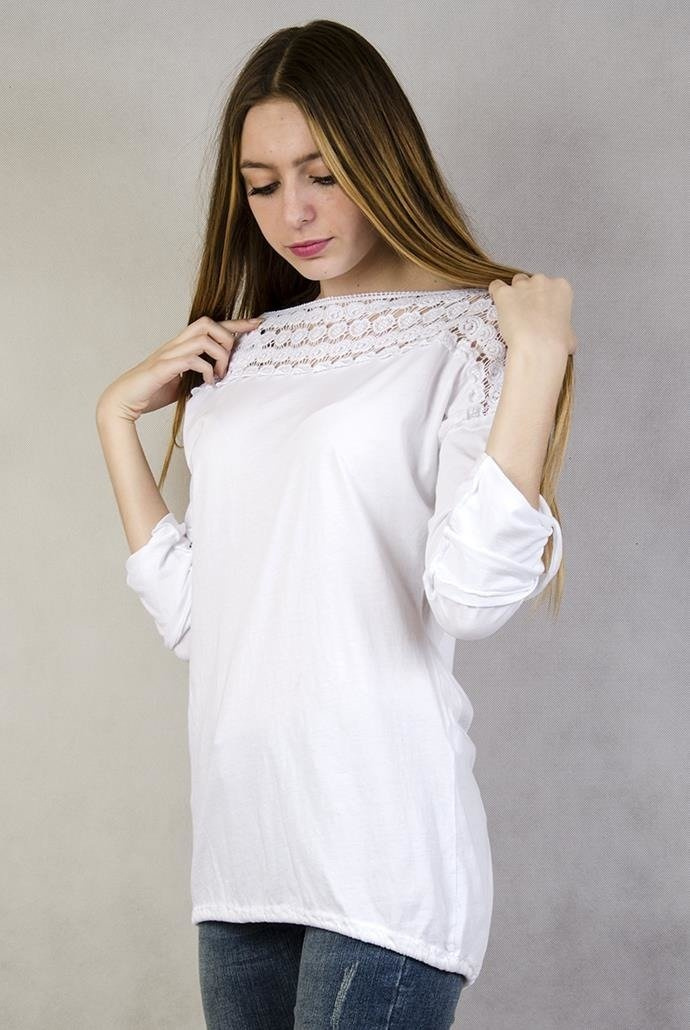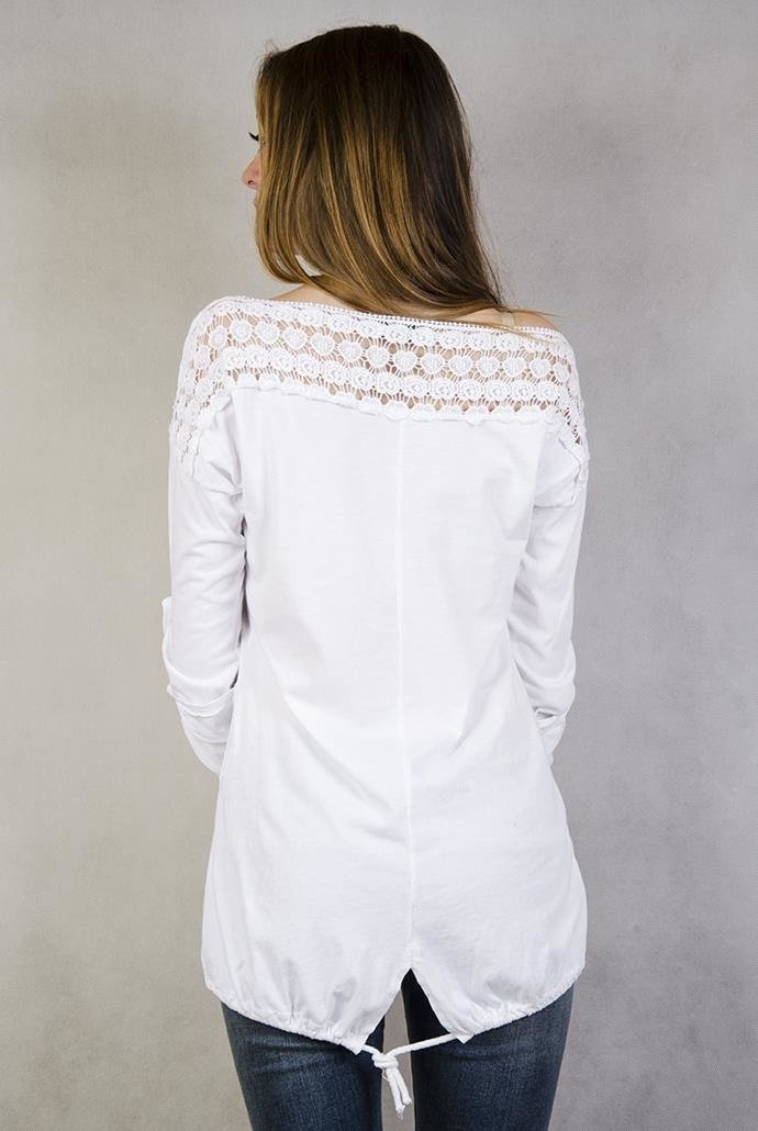 Biała bluzka z ażurowym zdobieniem na dekolcie i ramionach
