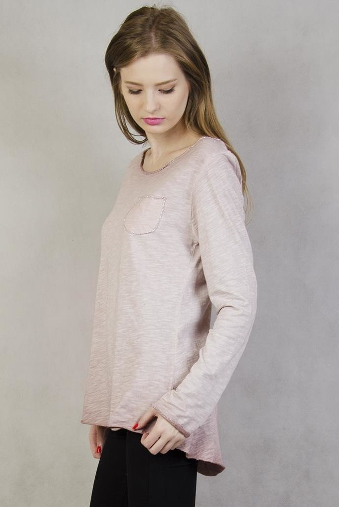 Różowa bluzka z kieszonką i srebrną nitką przy dekolcie i kieszonce