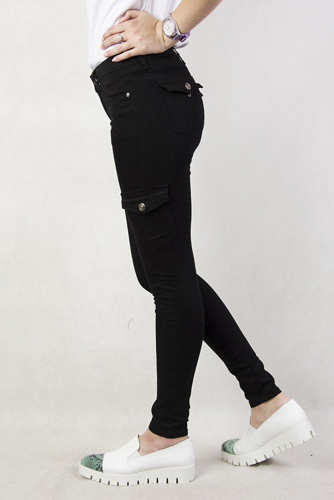 Czarne spodnie bojówki z kieszeniami po bokach.