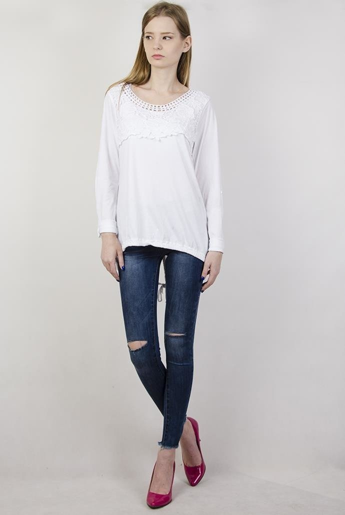 Biała bluzka z ażurowymi zdobieniami przy dekolcie oraz ze ściągaczem na dole