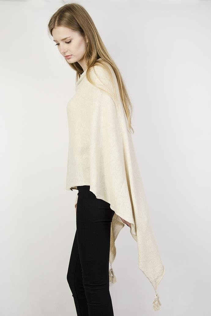 Beżowe ponczo z pomponami przy końcach