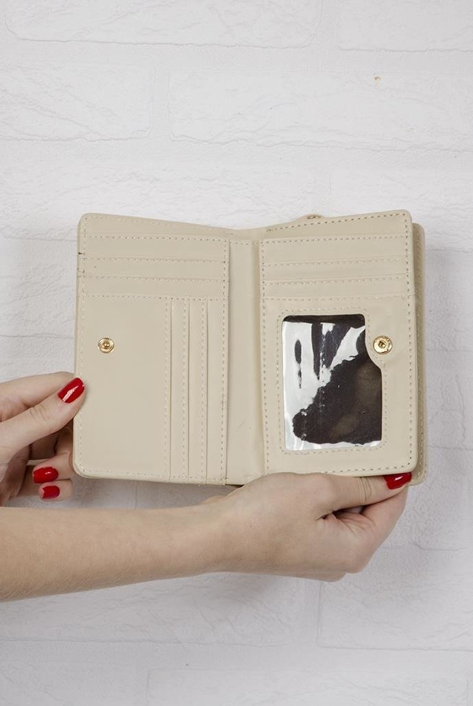 Beżowy portfel z licznymi przegródkami na banknoty oraz częścią zapinaną na zamek do przechowania monet WYMIARY: Szerokość: 15 cm Wysokość: 10 cm
