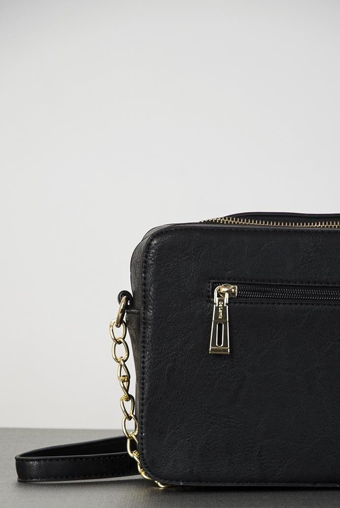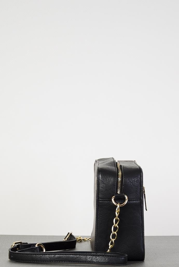 Duża czarna torebka na złotym łańcuszku o sztywnej strukturze, w środku brak dużych przegródek, po bokach małe przegródki np. na telefon