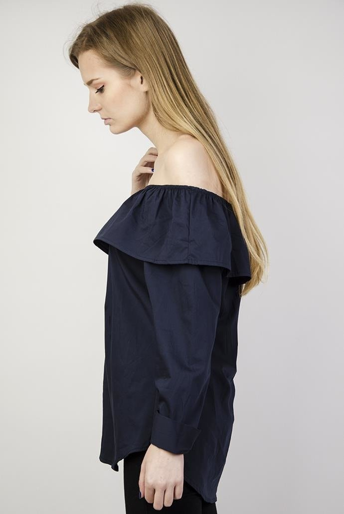 Koszula granatowa asymetryczna z hiszpańskim dekoltem, posiada guziki przy rękawach