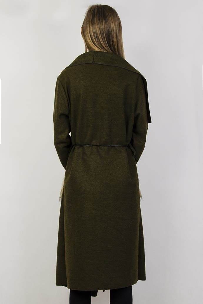 Zielona narzuta z rzemykiem w pasie i futerkiem przy kieszeniach
