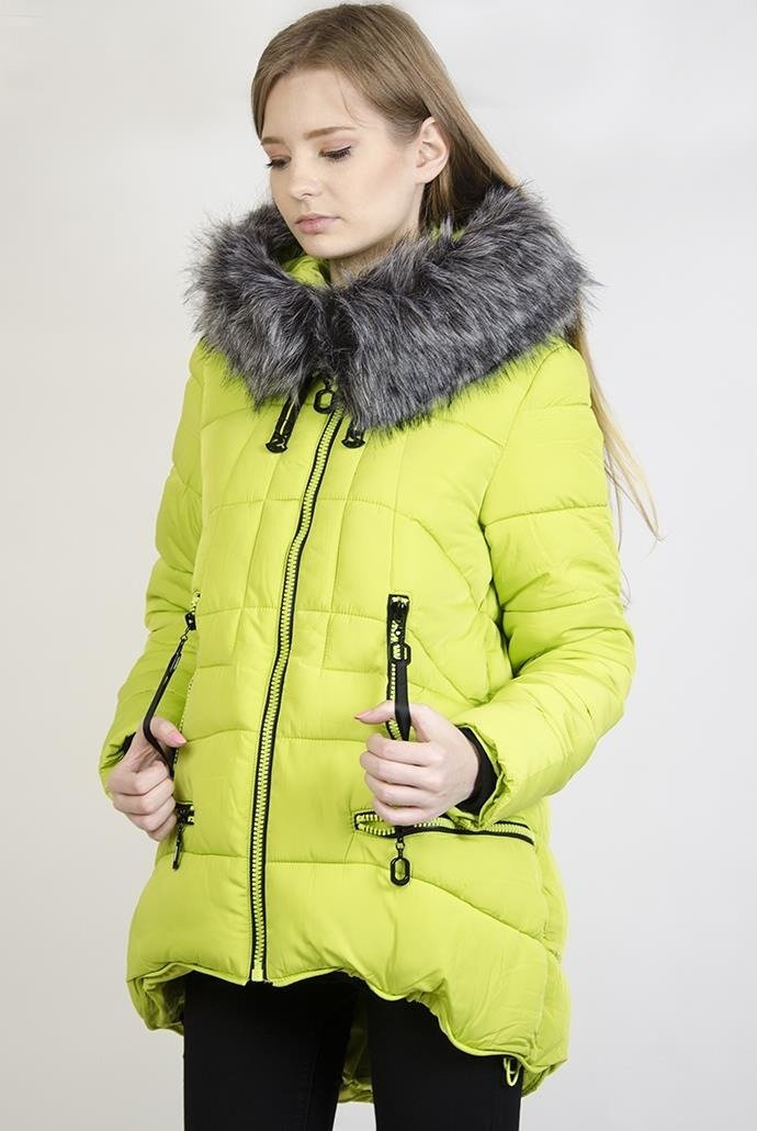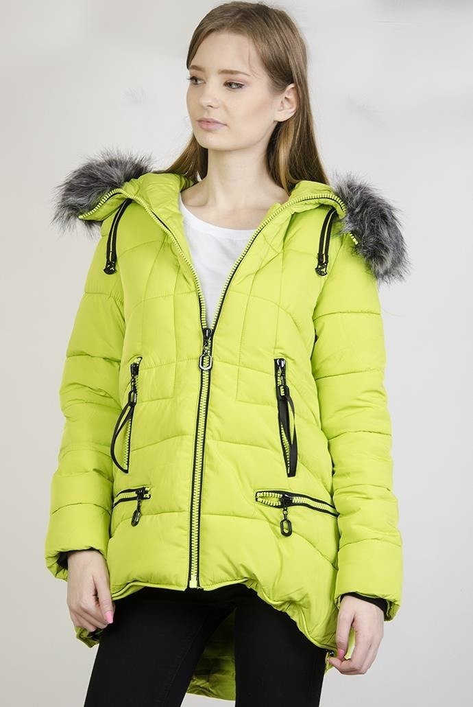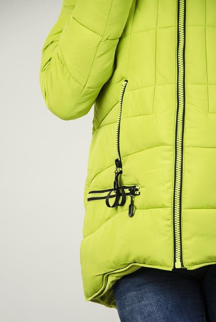 Ocieplana limonkowa asymetryczna kurtka z kapturem.