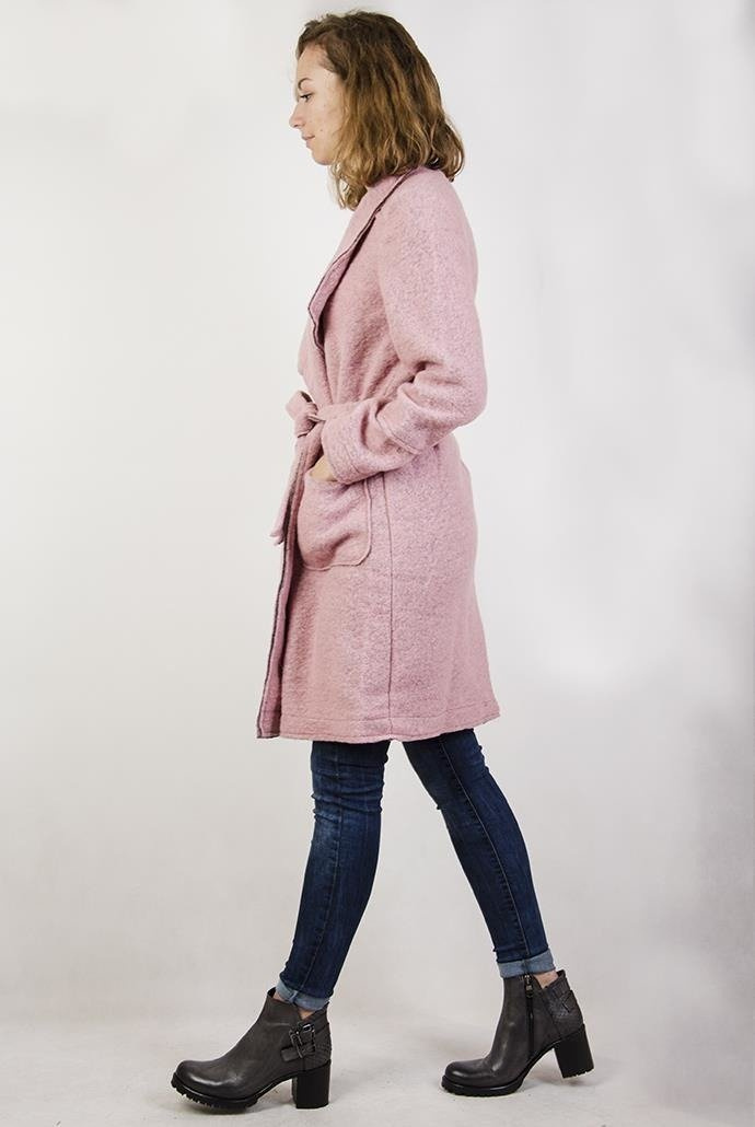 Jasnoróżowy długi płaszcz z kieszeniami, wiązany w pasie