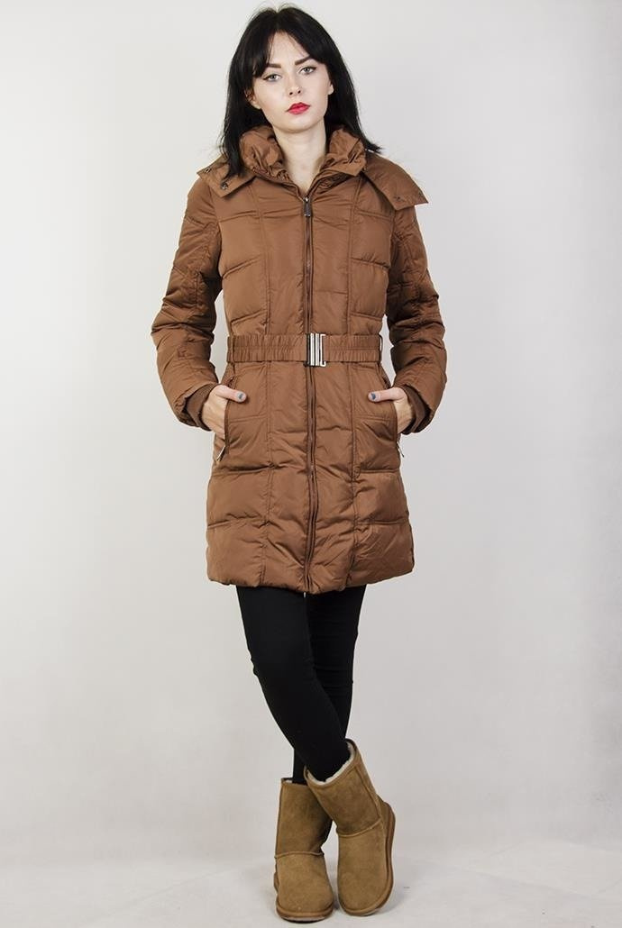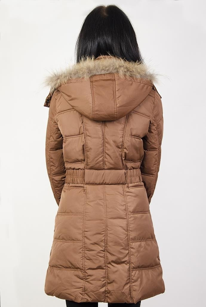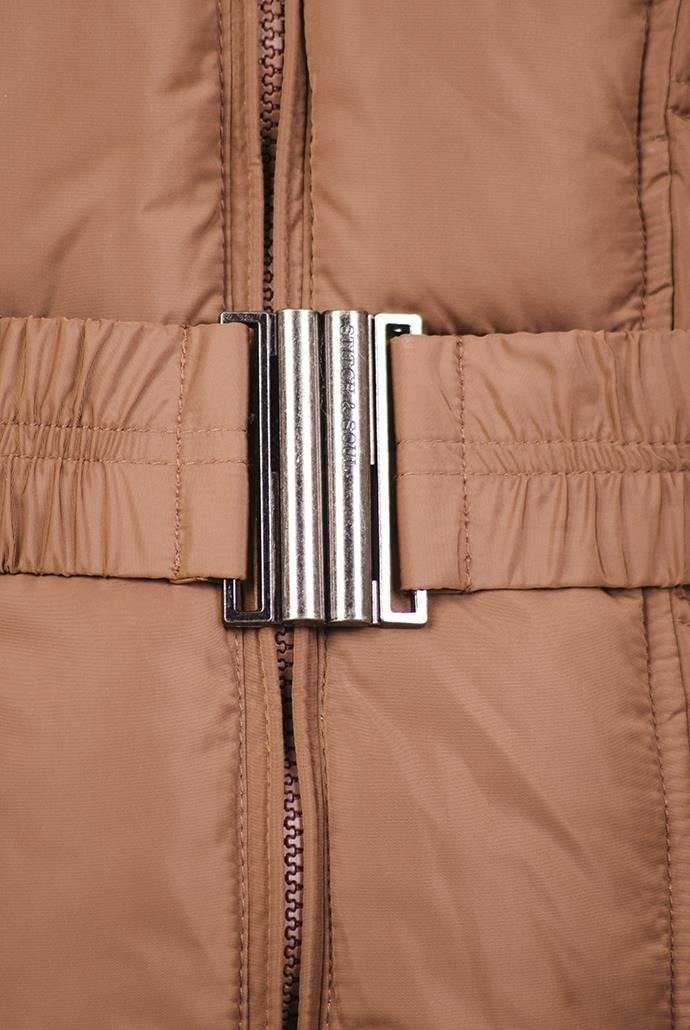 Brązowa kurtka zapinana na zamek oraz klamrę w pasie. Posiada kaptur obszyty futerkiem, który można odczepić.