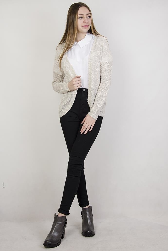 Jasnoszary sweterek narzutka ze ściągaczami przy rękawach oraz na dole