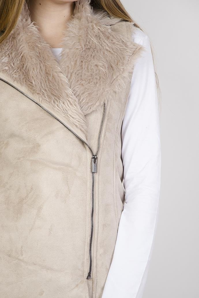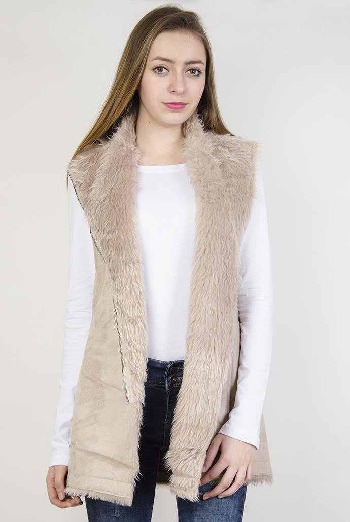 Beżowa kamizelka z futerkowym wnętrzem, zapinana na zamek