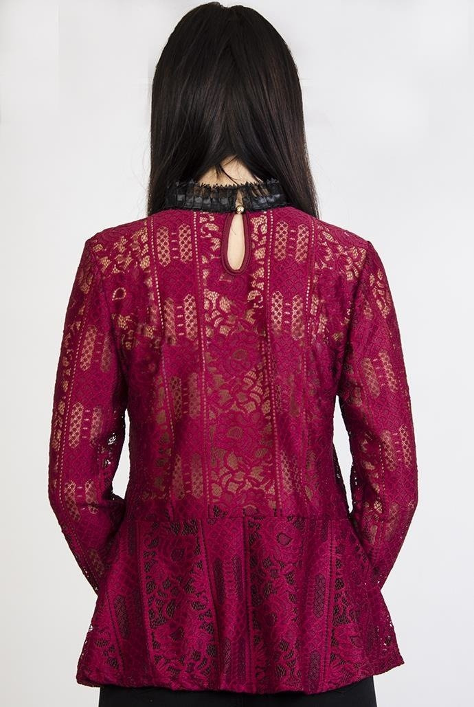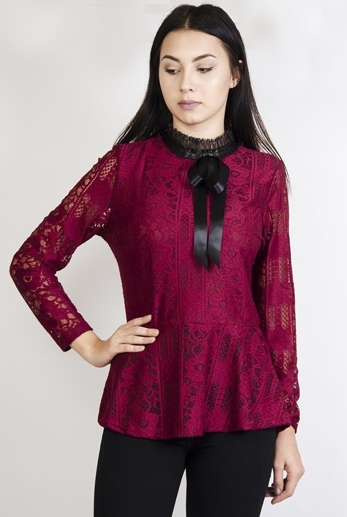 Bordowa, koronkowa bluzka z baskinką i czarnymi wstawkami. Posiada kokardę przy szyi.