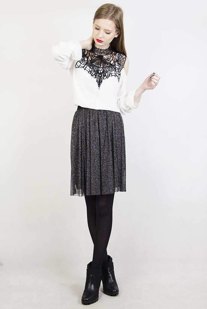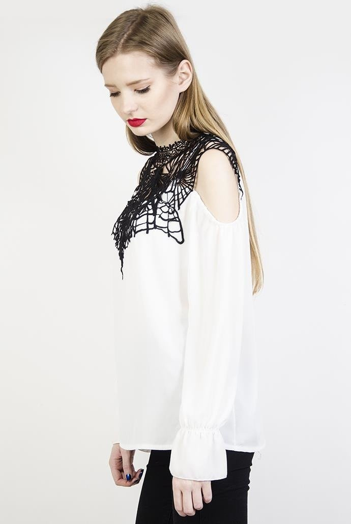 Biała koszula z ażurowym zdobieniem, posiada także wiązanie przy szyi oraz gumkę przy rękawie.