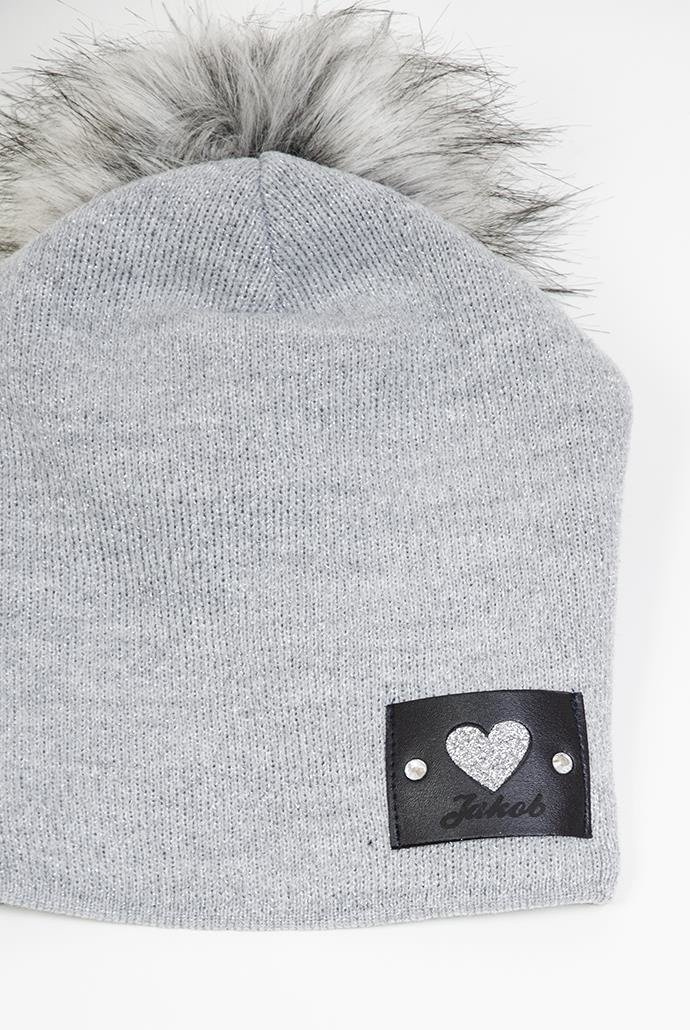 Szara czapka z wszywką z serduszkiem i pomponem.