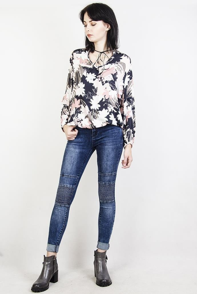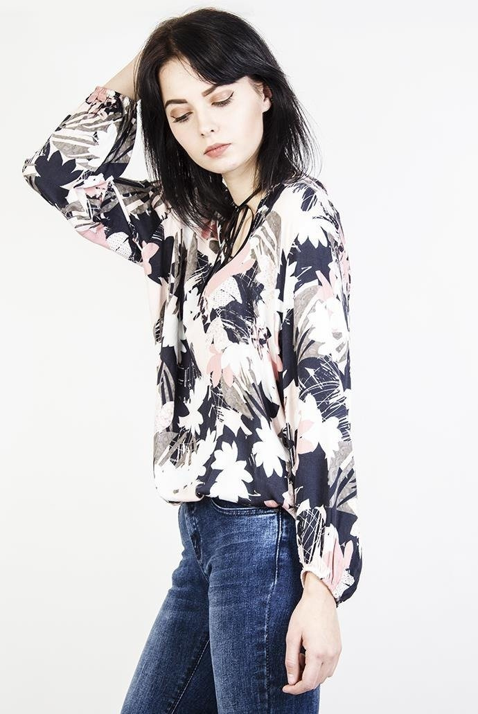 Bluzka w motyw kwiatowy, z wiązaniem w dekolcie. Posiada gumkę przy rękawie oraz na dole.