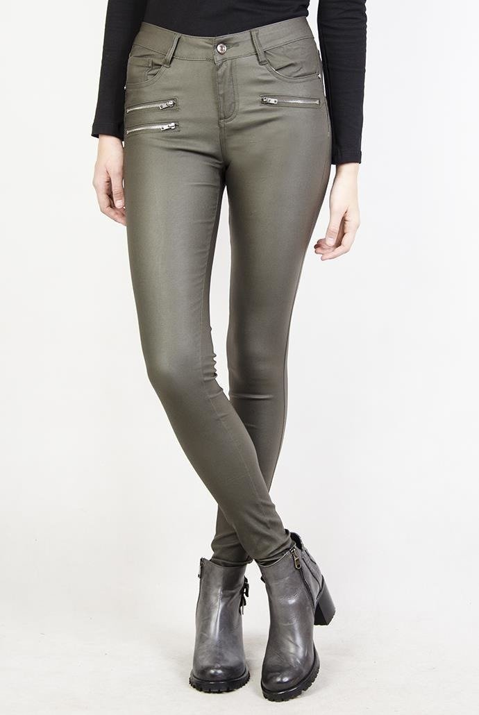 Zielone spodnie skórkowe z trzema srebrnymi zamkami.