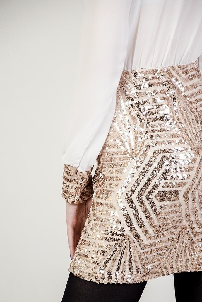 Biała sukienka z cekinowym, złotym dołem
