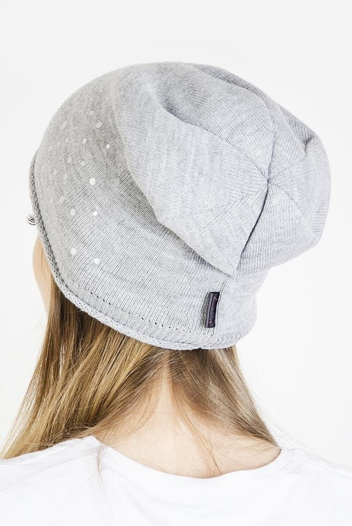 Jasnoszara czapka ze srebrnymi kropkami, z tyłu posiada podszycie.
