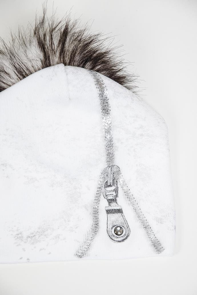 Biała czapka z pomponem i nadrukiem zamkiem.