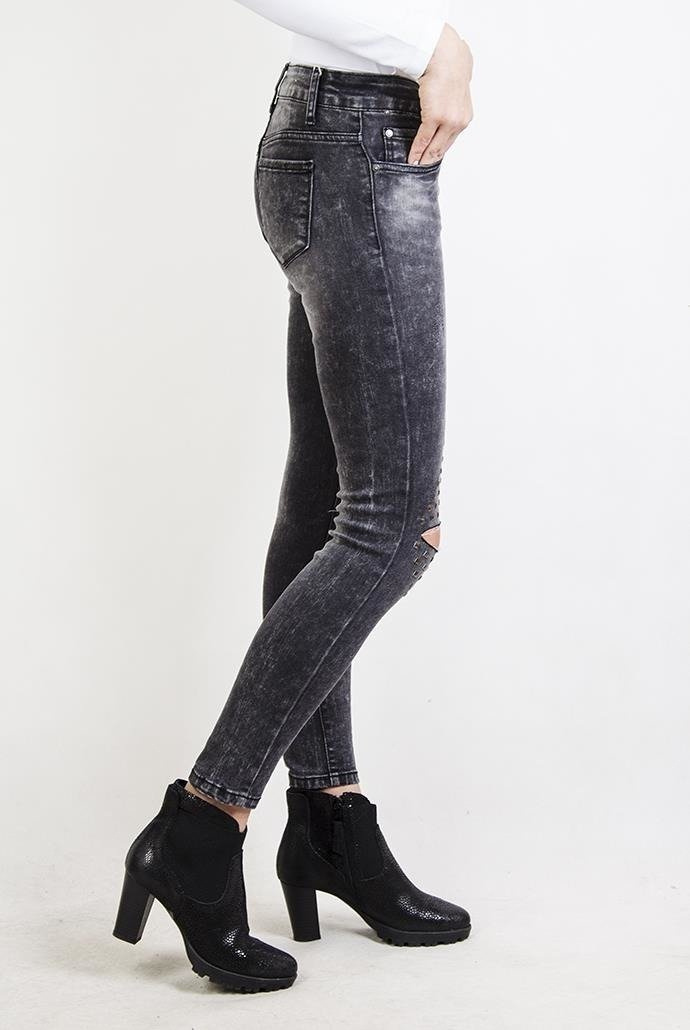 Szare spodnie jeansowe, przylegające, z ćwiekami i wycięciami przy kolanie.