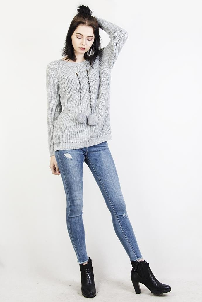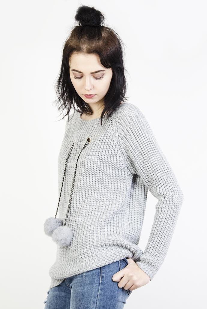 Szary sweter z pomponami na łańcuszku