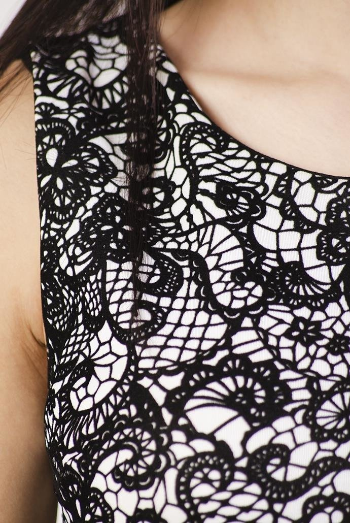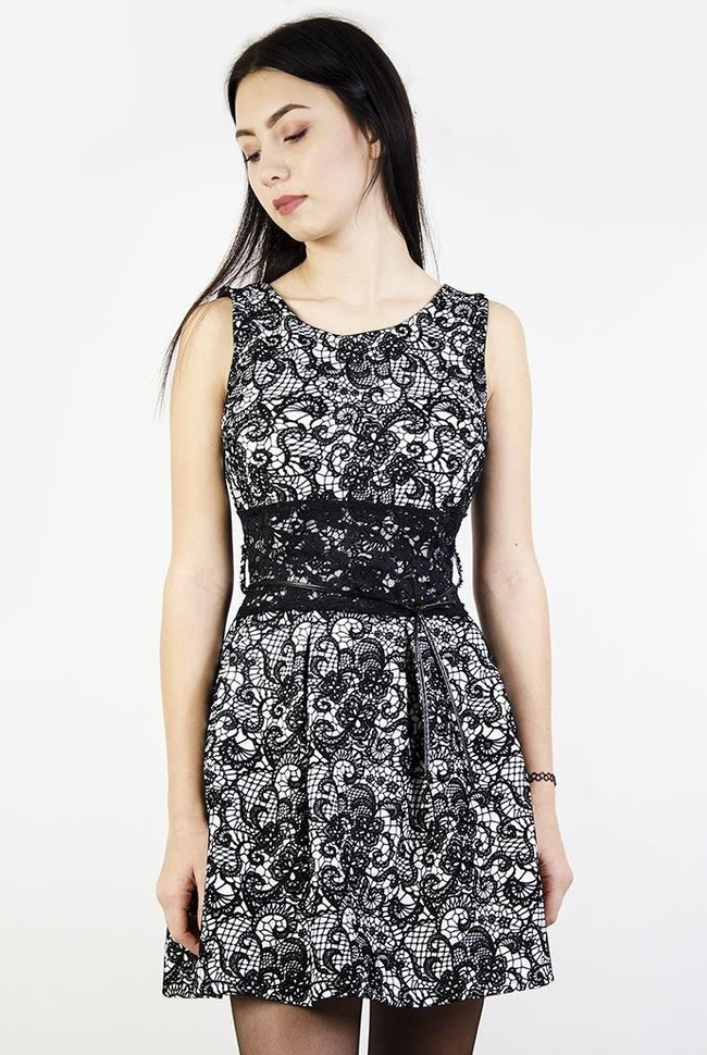 Biała sukienka z wytłoczonym motywem kwiatowym, wykończona koronką. Posiada rzemyk w talii, zapinana z tyłu.