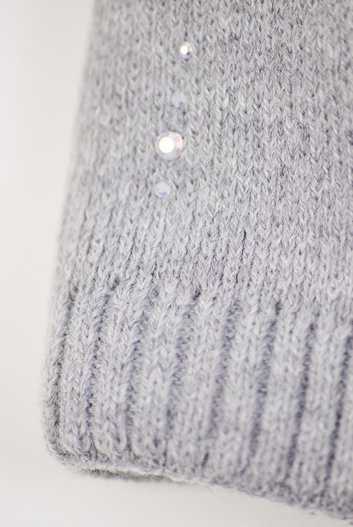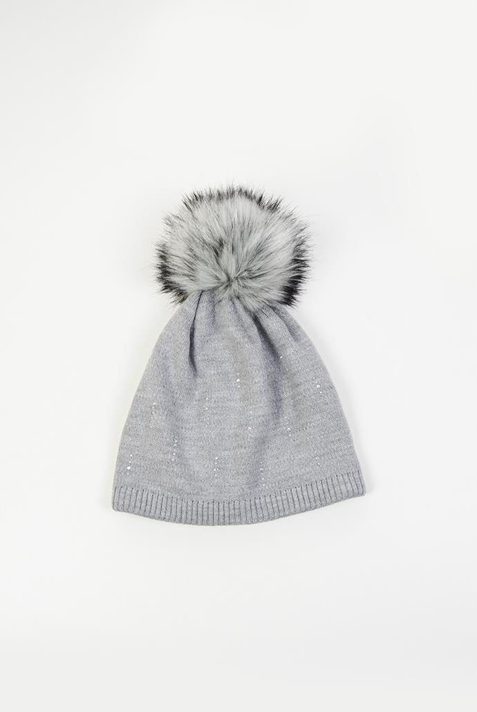 Jasnoszara czapka z cyrkoniami i pomponem, posiada ocieplenie wewnątrz w postaci polaru.