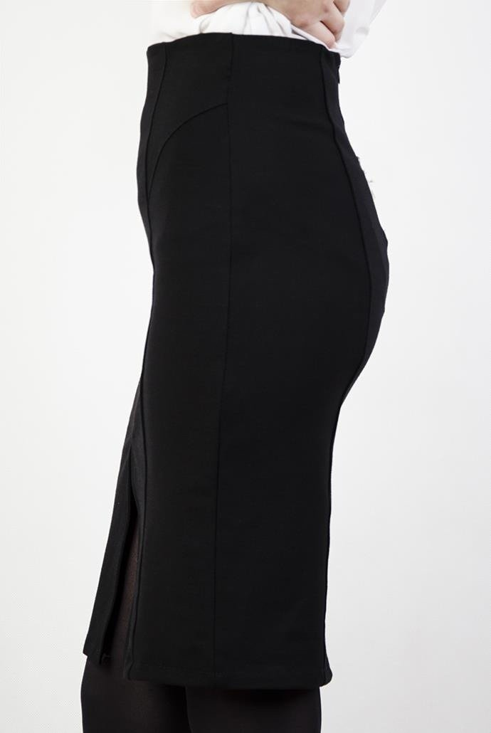Czarna spódniczka ołówkowa z przeszyciami i wycięciem, z tyłu zapinana na zamek.