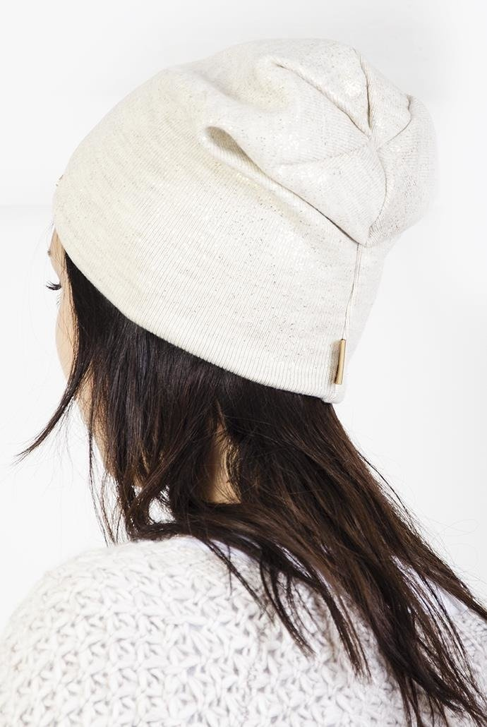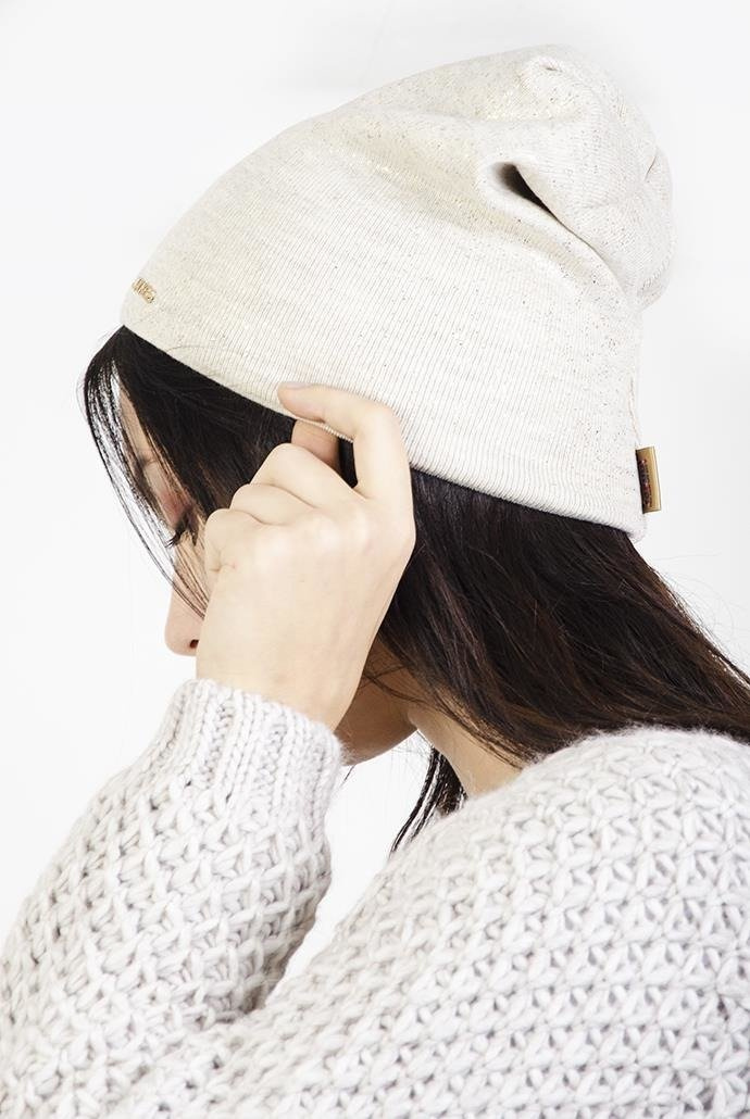 Beżowa czapka ze złotymi drobinkami i naszywką "JAKOB"