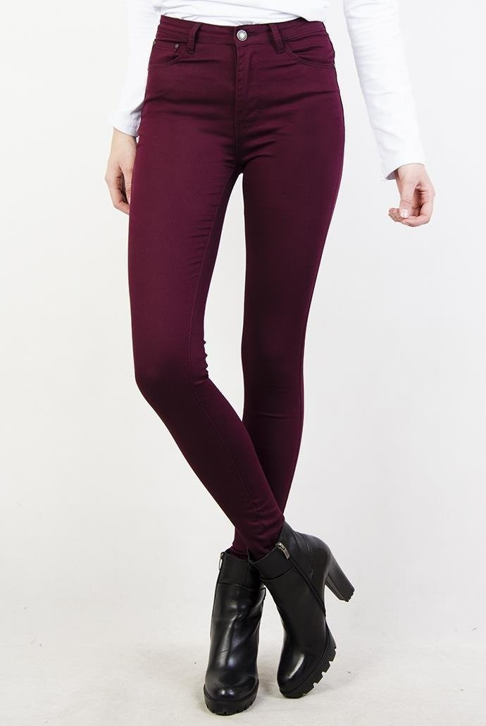 Bordowe spodnie skinny jeans z wysokim stanem.
