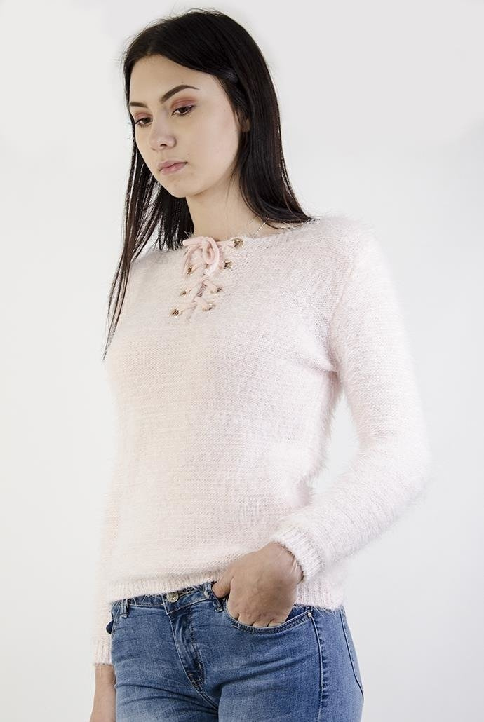 Jasnoróżowy, włochaty sweterek z wiązaniem w dekolcie.