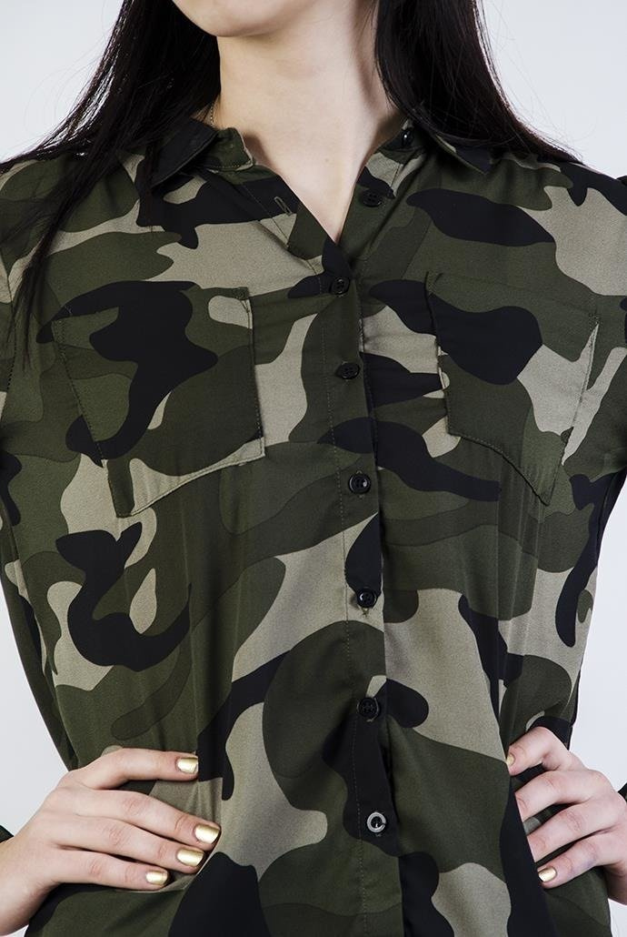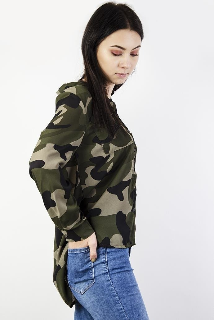 Asymetryczna koszula moro z kieszeniami. Wykonana z lekkiego, gładkiego materiału. Nie prześwituje.