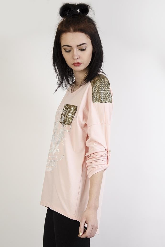 Jasnoróżowa bluzka z nadrukiem i złotymi elementami. Posiada guzik do podwinięcia rękawa.