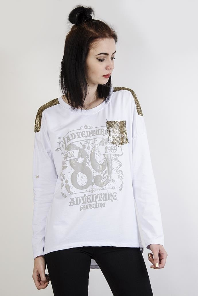 Biała bluzka z nadrukiem i złotymi elementami. Posiada guzik do podwinięcia rękawa.