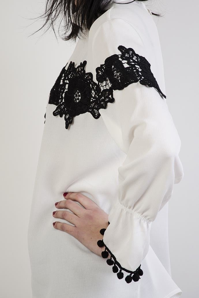 Biała bluzka z czarnym, ażurowym zdobieniem.