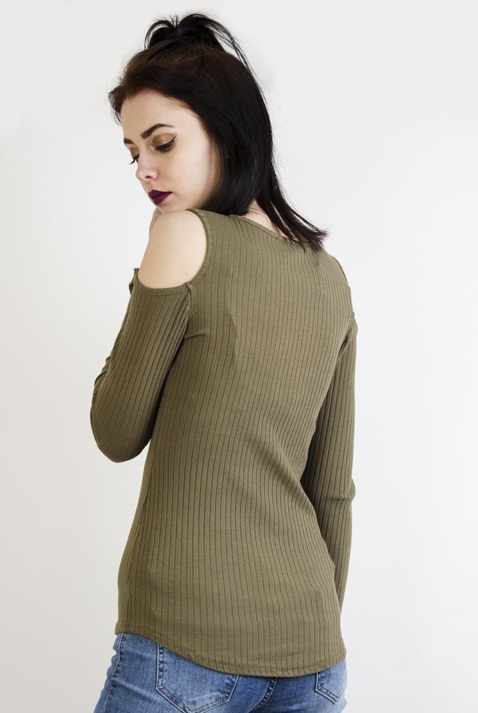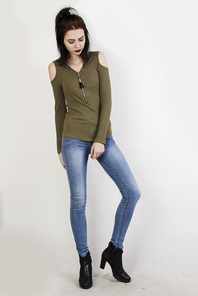 Zielona prążkowana bluzka z odkrytymi ramionami zapinana na zamek