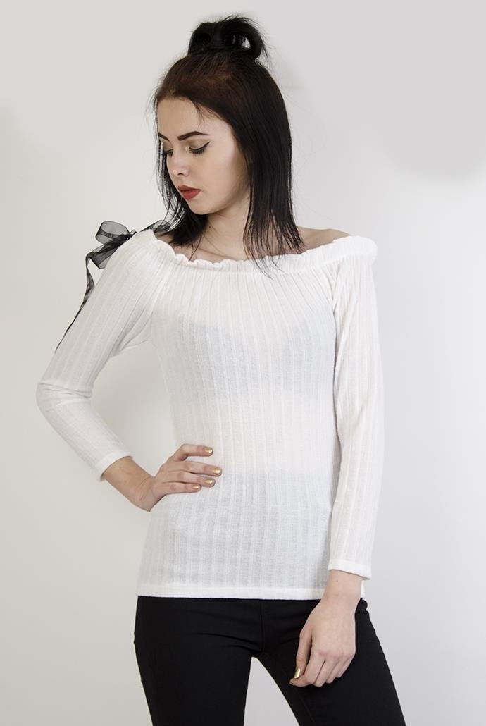 Biała prążkowana bluzka z odkrytymi ramionami wiązana czarną wstążką