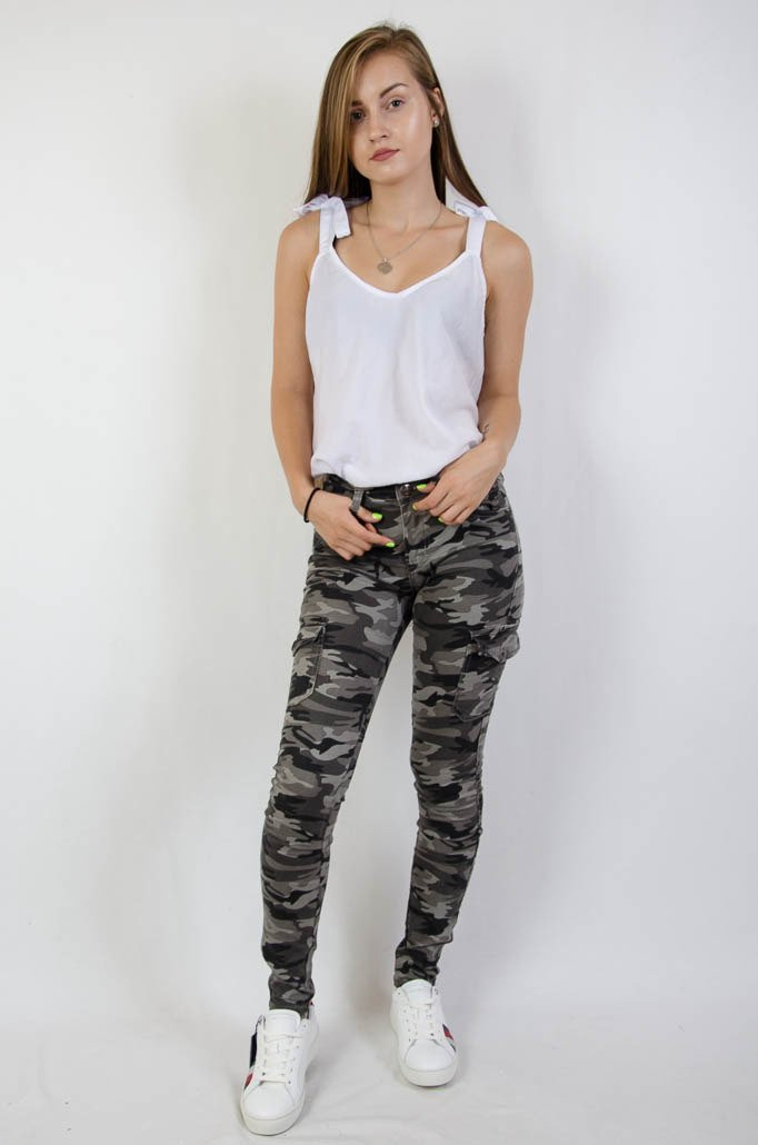 Spodnie moro z kieszeniami, idealnie przylegające.
