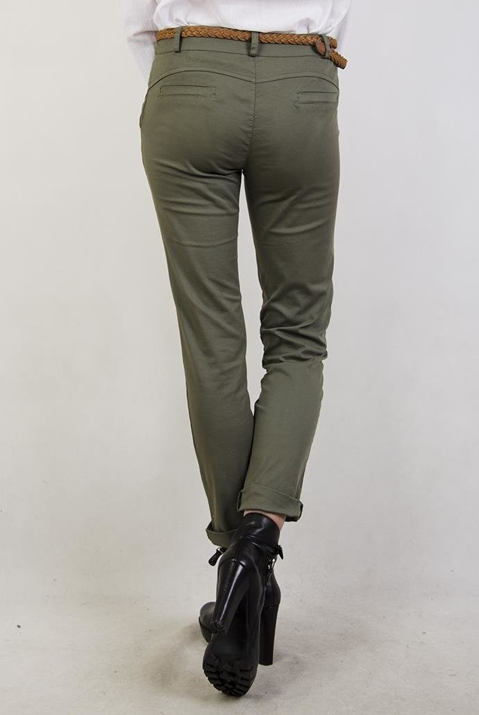 Zielone spodnie materiałowe z brązowym paskiem w zestawie.