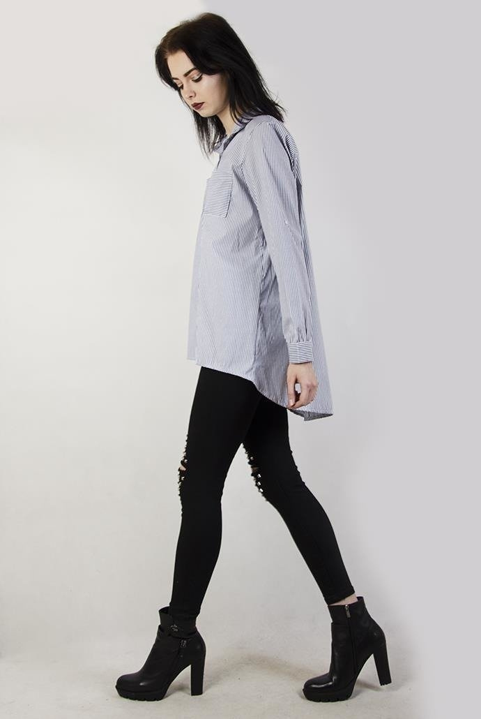 Szara koszula w paski, zapinana na guziki, z kieszonkami