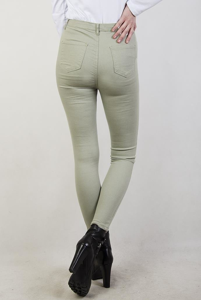 Jasnozielone spodnie skinny jeans z ćwiekami i dziurami. Posiadają wysoki stan.