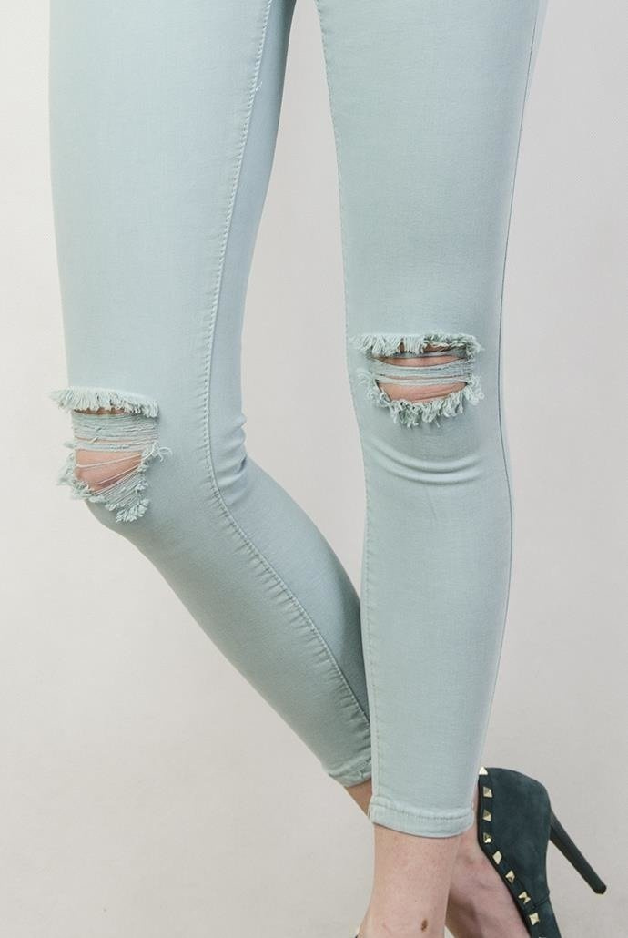 Jasnozielone spodnie jeansowe z wycięciami i wysokim stanem