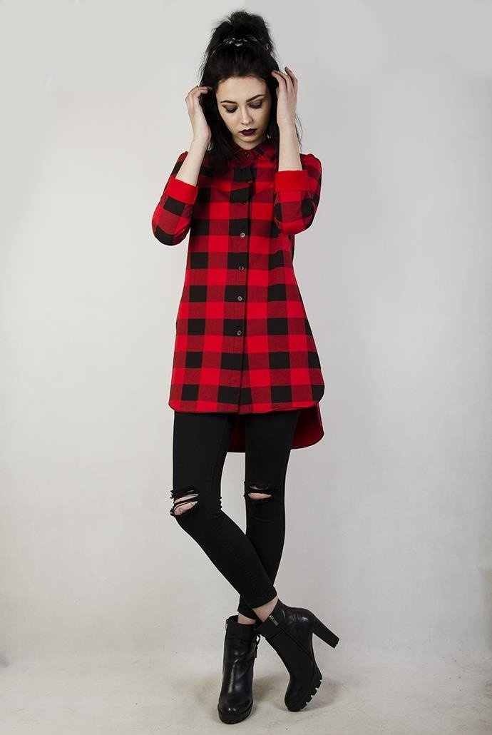 Asymetryczna koszula w czarno-czerwoną kratę. Zapinana na guziki.
